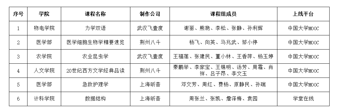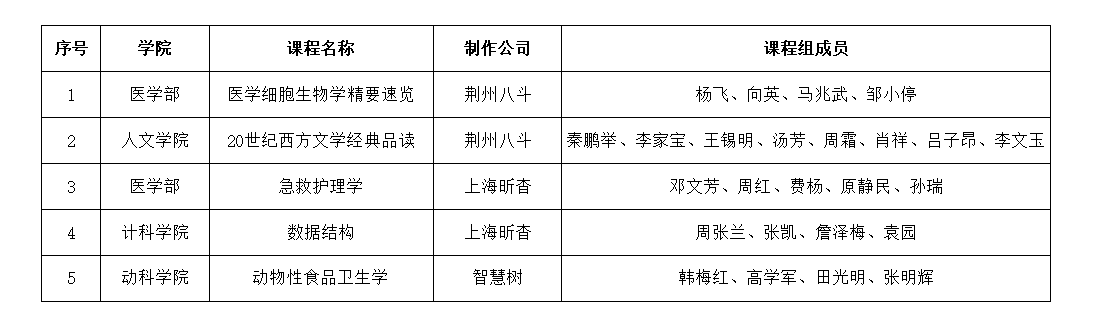 根据在线开放课程验收工作安排,经课程组自主申报、专家评审,《医学细胞生物学精要速览》等5门立项建设的在线开放课程已完成验收,符合在线开放课程上线标准,目前已在中国大学MOOC等相关平台完成上线并正式运行,现予以公布。