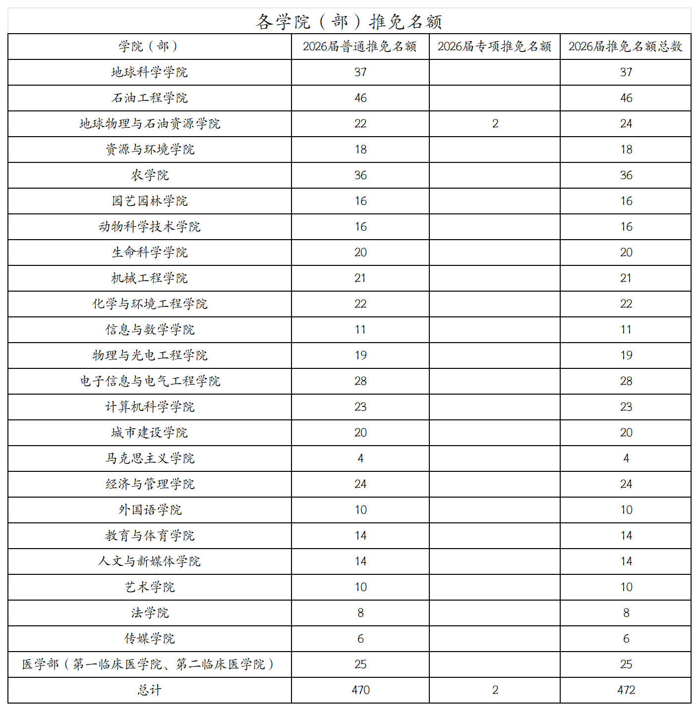 根据《mk体育官网推荐优秀应届本科毕业生免试攻读硕士学位研究生管理办法》(长大校发〔2025〕9号)文件相关规定,经学校研究,确定各学院(部)推免名额(见附件)。请各学院(部)按照《关于做好推荐2026届优秀本科毕业生免试攻读硕士学位研究生工作的通知》要求制定本单位推免名额分配方案(各专业候补名额须明确),报本科生院审核后,在本单位网站公布。