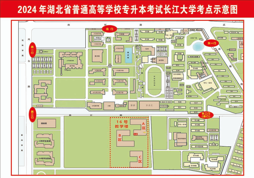 1.2024年mk体育官网专升本考试考场设置在东校区(湖北省荆州市南环路1号)16号教学楼B区,东校区各校门均可进出,建议广大考生走东二门(南门)进出校园。