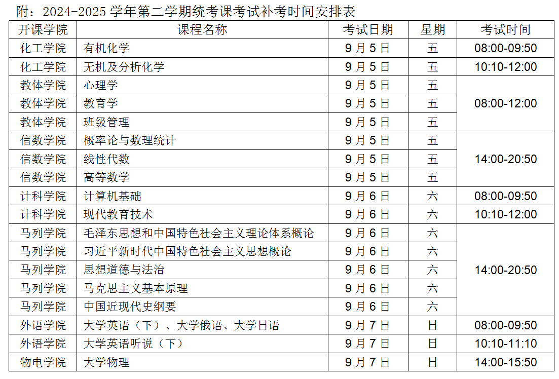 2. 全校通识教育必修课及大面积学科基础课的补考时间安排见附表,各专业课程的考试安排在9月3日-7日进行,应确保考生考试时间无冲突。