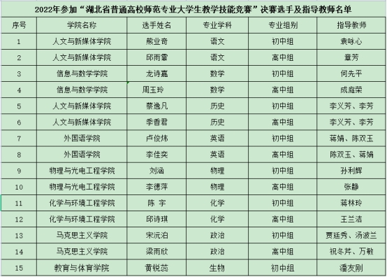 根据湖北省“关于举办第十一届湖北省普通高校师范专业大学生教学技能竞赛的通知(第1号)”要求,mk体育官网8个师范专业(方向)经过初赛推选出了15名优秀选手代表学校参加湖北省决赛。具体名单公布如下: