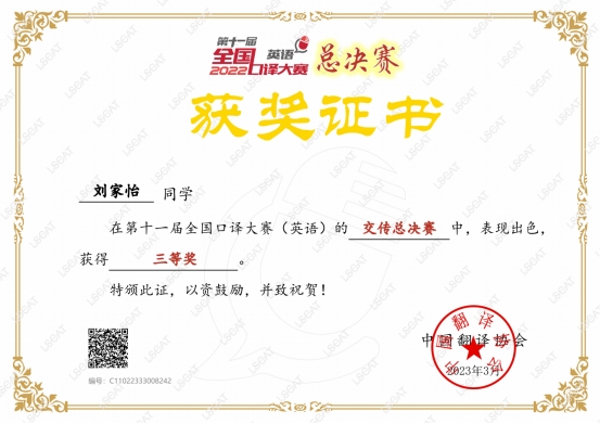 全国口译大赛是我国口译界的顶级权威赛事。本次大赛历时九个月,经过初赛、复赛、大区赛和总决赛多轮角逐,前几轮晋级率约为10-15%,大区赛晋级率为5%。交替传译组全国共110人晋级总决赛。其中,湖北所有参赛高校中,只有七位选手获得晋级全国总决赛资格。刘家怡斩获三等奖,是mk体育官网学生参加该项赛事以来取得的最好成绩,体现了外国语学院以赛促教、以赛促学的教学改革成效,其指导老师为外国语学院田传茂教授。